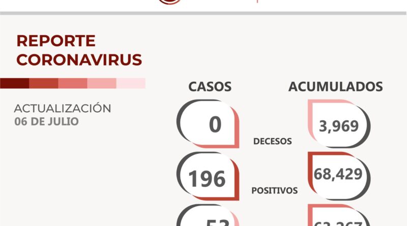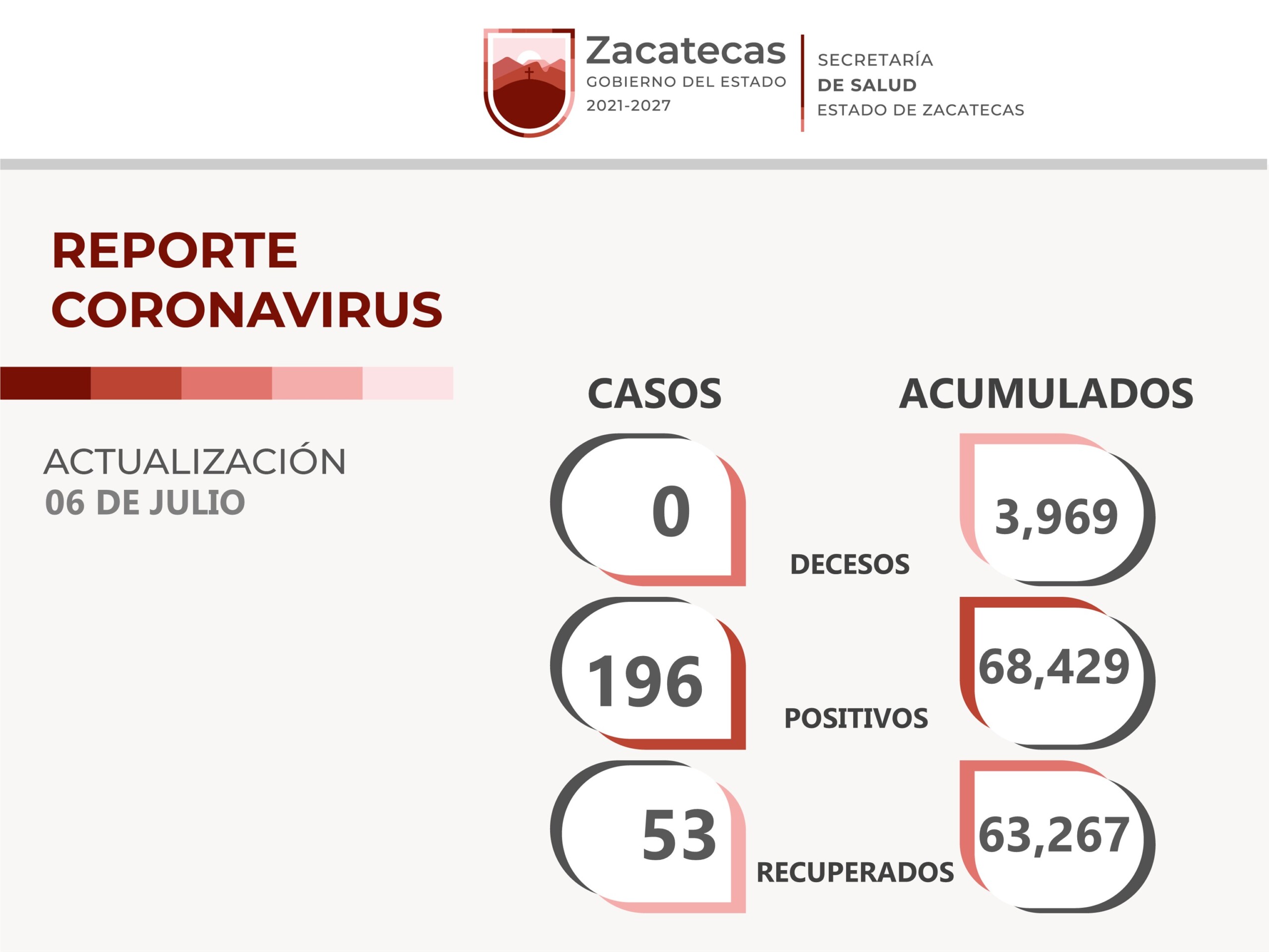 Zacatecas, Zac., 06 de julio del 2022.- Este miércoles, en Zacatecas fueron detectados 196 nuevos positivos a la COVID-19, así como a 53 zacatecanos que superaron la enfermedad. Con lo cual, el acumulado de casos confirmados es de 68 mil 429 y de recuperados es de 63 mil 267.
