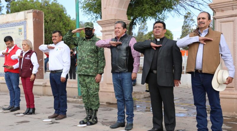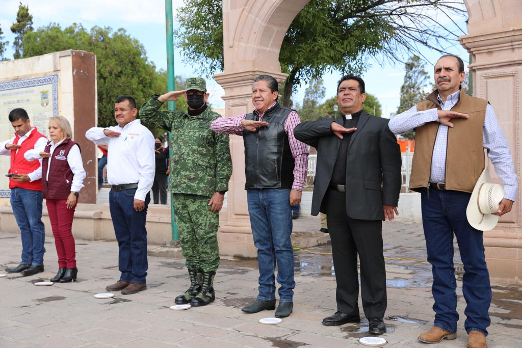 Cañitas de Felipe Pescador, Zac., 12 de julio de 2022.- Desde que asumí el mandato constitucional que me confirió el pueblo, en la administración pública trabajamos para encauzar a Zacatecas por el sendero del bienestar y del desarrollo, manifestó el Gobernador David Monreal Ávila al encabezar la ceremonia de Honores a la Bandera en el municipio de Cañitas de Felipe Pescador.