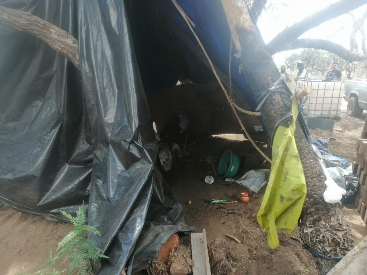 Durante los recorridos, el grupo aéreo de la Policía Estatal solicitó apoyo terrestre, ya que, entre las comunidades de Milagros y Colonia Hidalgo, se logró ubicar un sitio que por sus características corresponde a un campamento que era utilizado por integrantes de un grupo delincuencial.