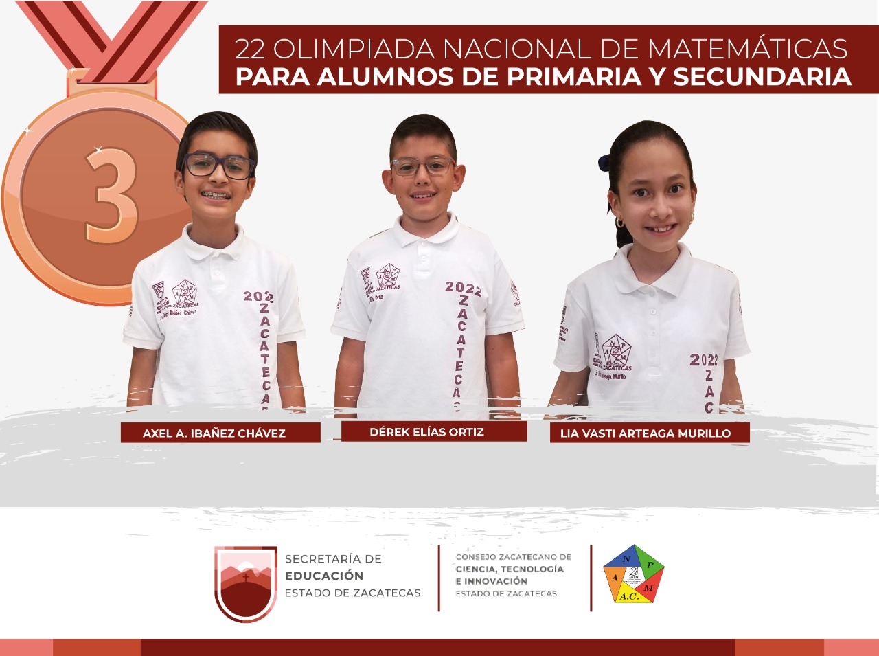 La medalla de bronce fue para Lía Vástegui Arteaga Murillo, de la primaria Julián T. Medina, de Guadalupe; Axel Ahtziri Ibáñez, de la primaria Héroes Patrios, de Zacatecas y Derek Elías Ortiz, de la primaria 23 de junio, ubicada en San Antonio del Ciprés, Pánuco.