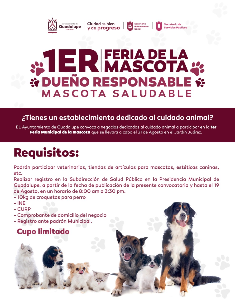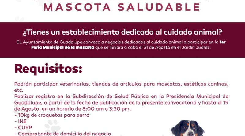 El Ayuntamiento de Guadalupe, que encabeza el alcalde Julio César Chávez Padilla, a través de las Secretarías del Bienestar Social y de Servicios Públicos, convoca a los establecimientos dedicados al cuidado animal a la Primera Feria de la Mascota, denominada ‘Dueño responsable, mascota saludable’.