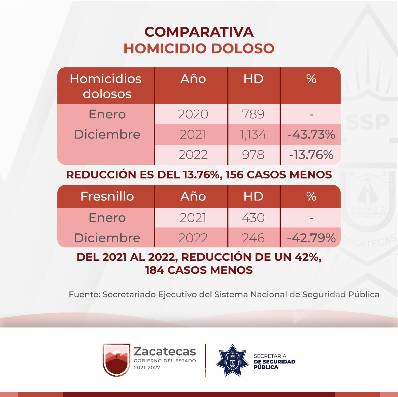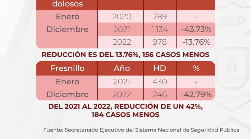 Zacatecas, Zac., 18 de enero de 2023.- En Zacatecas se registró una reducción de homicidios, tanto dolosos como culposos, de 7.57 por ciento en el 2022, al pasar de 1 mil 467 en 2021 a 1 mil 356 el año pasado, de acuerdo a las cifras proporcionadas por el Secretariado Ejecutivo del Sistema Nacional de Seguridad