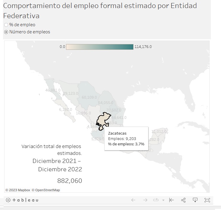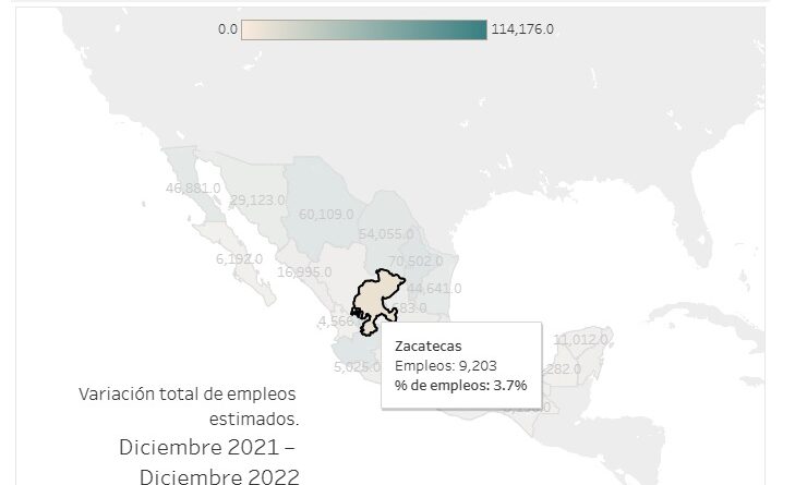 Zacatecas, Zac., 25 de enero de 2023.- Conforme a los objetivos del Gobierno de Zacatecas, encabezado por el mandatario David Monreal Ávila, de impulsar la generación de empleos, el Instituto Nacional de Estadística y Geografía (Inegi) reportó que la entidad registró, entre diciembre de 2021 y diciembre de 2022, un crecimiento de 9 mil 203 empleos, que representan un 3.7 por ciento de incremento de empleo formal estimado a tasa anual.