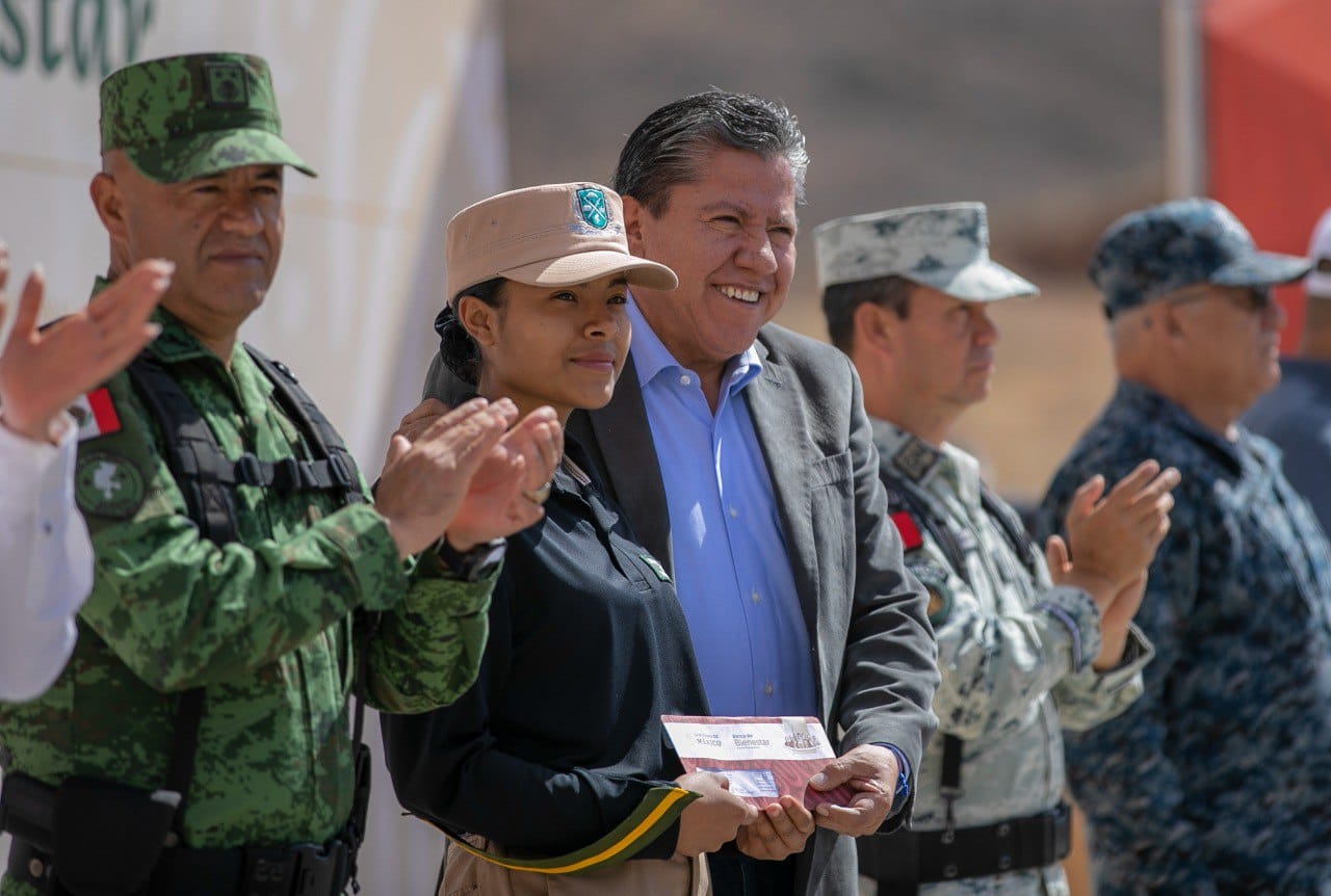 Sargentos primeros de cadetes recibieron de manos del Gobernador y de la representante del Presidente López Obrador, la Delegada de Programas para el Desarrollo, Verónica Díaz Robles, su tarjeta del Banco del Bienestar, a través de la cual, sin intermediarios, recibirán su beca bimestral, con la cual, el Gobierno de la Cuarta Transformación evidencia su compromiso con la educación.