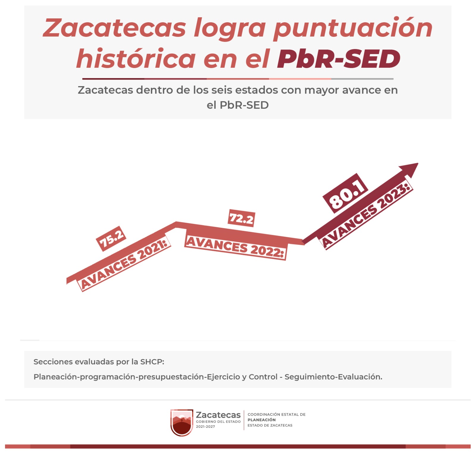 Zacatecas, Zac., 15 de mayo de 2023.- De acuerdo con la evaluación diagnóstica que anualmente realiza la Secretaría de Hacienda y Crédito Público (SHCP) a todas las entidades federativas, el Gobierno de Zacatecas alcanzó una puntuación sin precedentes de 80.1 en las mediciones del avance en la implementación del Presupuesto Basado en Resultados y Sistema de Evaluación del Desempeño (PbR-SED).