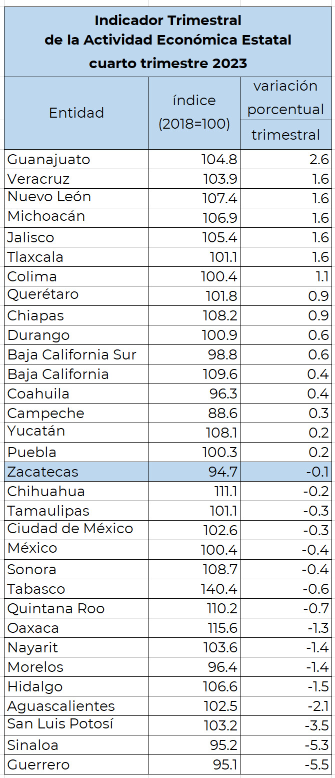 El sólido desempeño económico de Zacatecas durante el último trimestre del año 2023 refleja la capacidad de adaptación de la entidad, y el lugar 17 en variación trimestral coloca a Zacatecas en línea con la dinámica económica nacional.