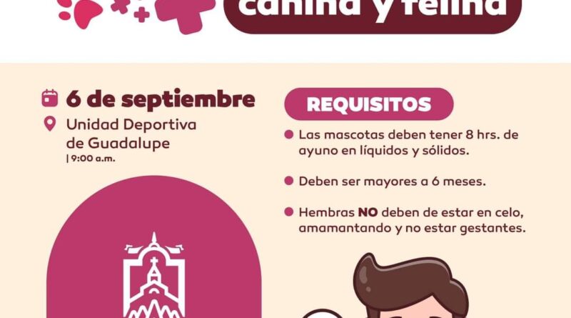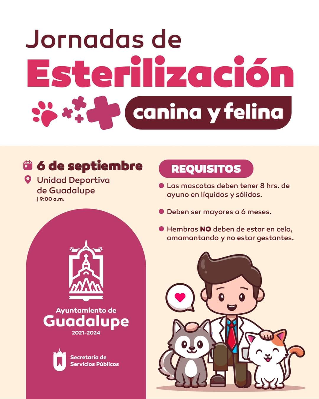 El Gobierno de Guadalupe que encabeza Pepe Saldívar, invita a la jornada de esterilización canina y felina a llevarse a cabo el próximo 6 de septiembre en la Unidad Deportiva de Guadalupe, en punto de las 9 de la mañana.