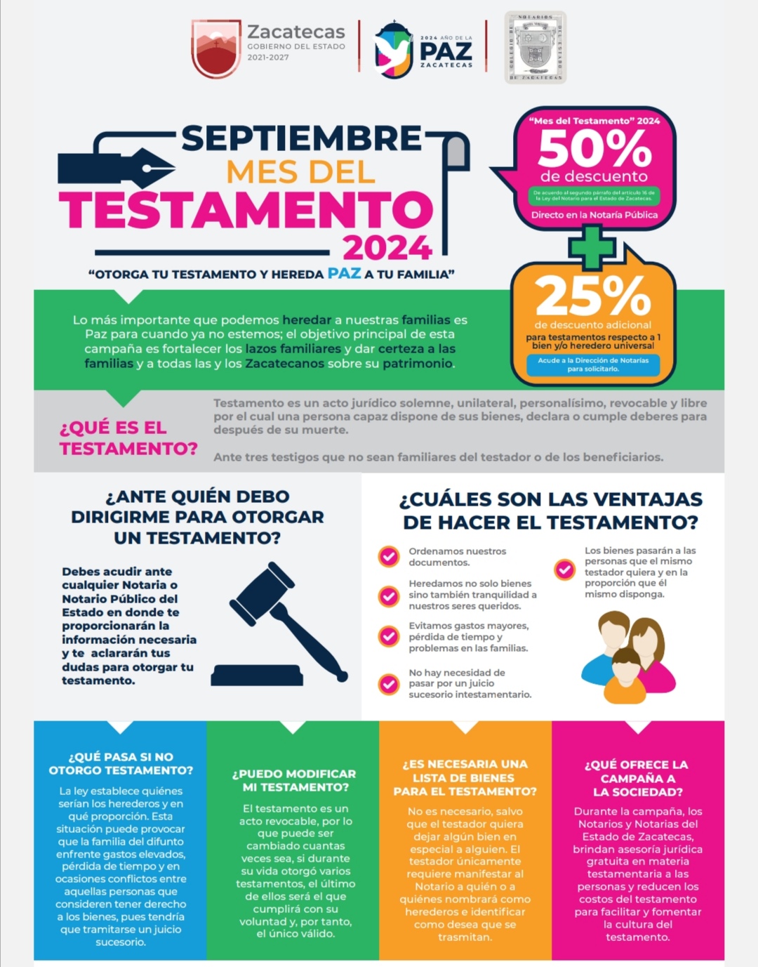 Zacatecas, Zac., 4 de septiembre de 2024.- El Gobernador David Monreal Ávila anunció que Zacatecas es el primer estado del país que, durante el mes de septiembre, ofrece descuentos de hasta 75 por ciento en la elaboración del testamento.