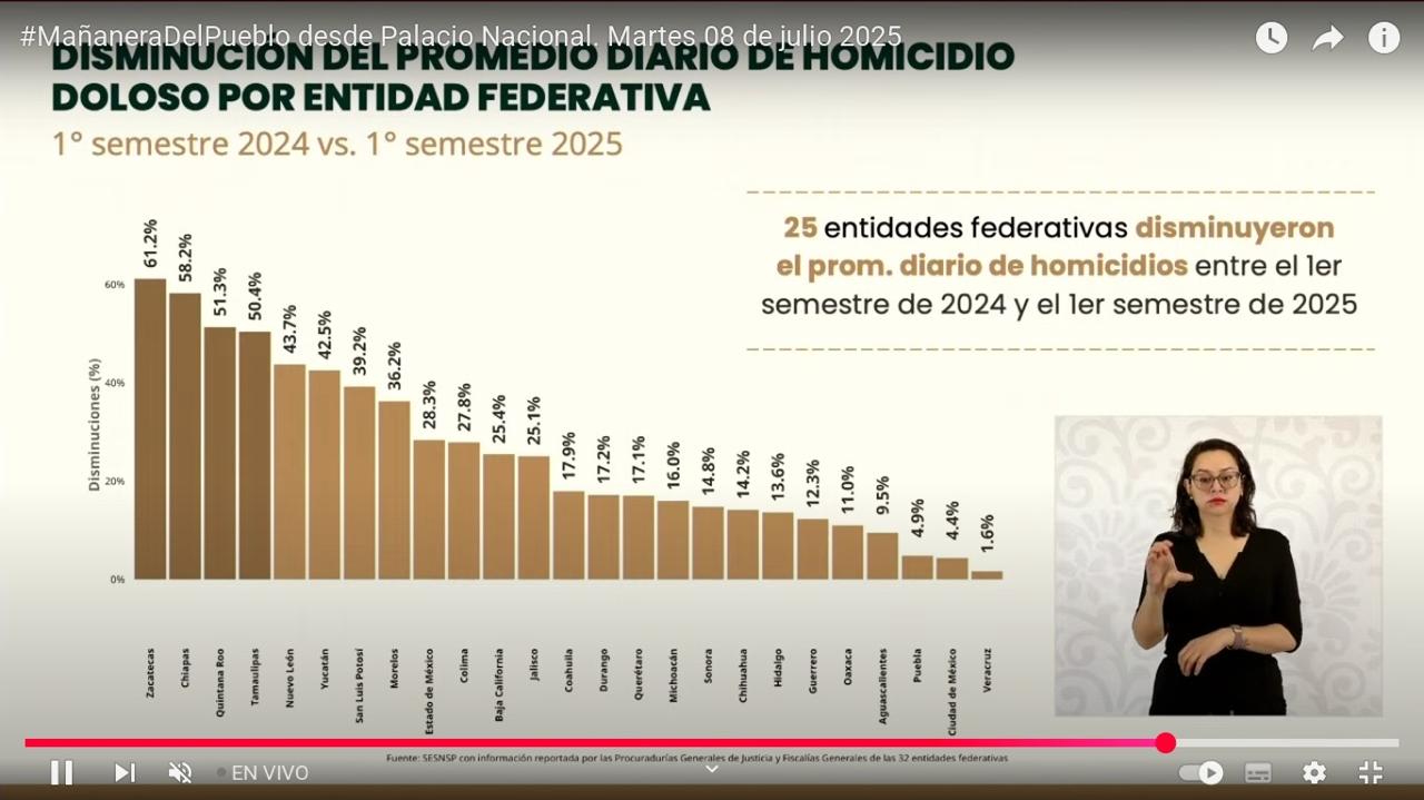 Ciudad de México, 8 de julio de 2025.- El estado de Zacatecas fue reconocido por el Gobierno de México, encabezado por la Presidenta Claudia Sheinbaum Pardo, al ser el estado con mayor reducción de homicidios dolosos, con una baja histórica del 61.2 por ciento en el primer semestre de 2025, de acuerdo con cifras del Secretariado Ejecutivo del Sistema Nacional de Seguridad Pública (SESNSP).