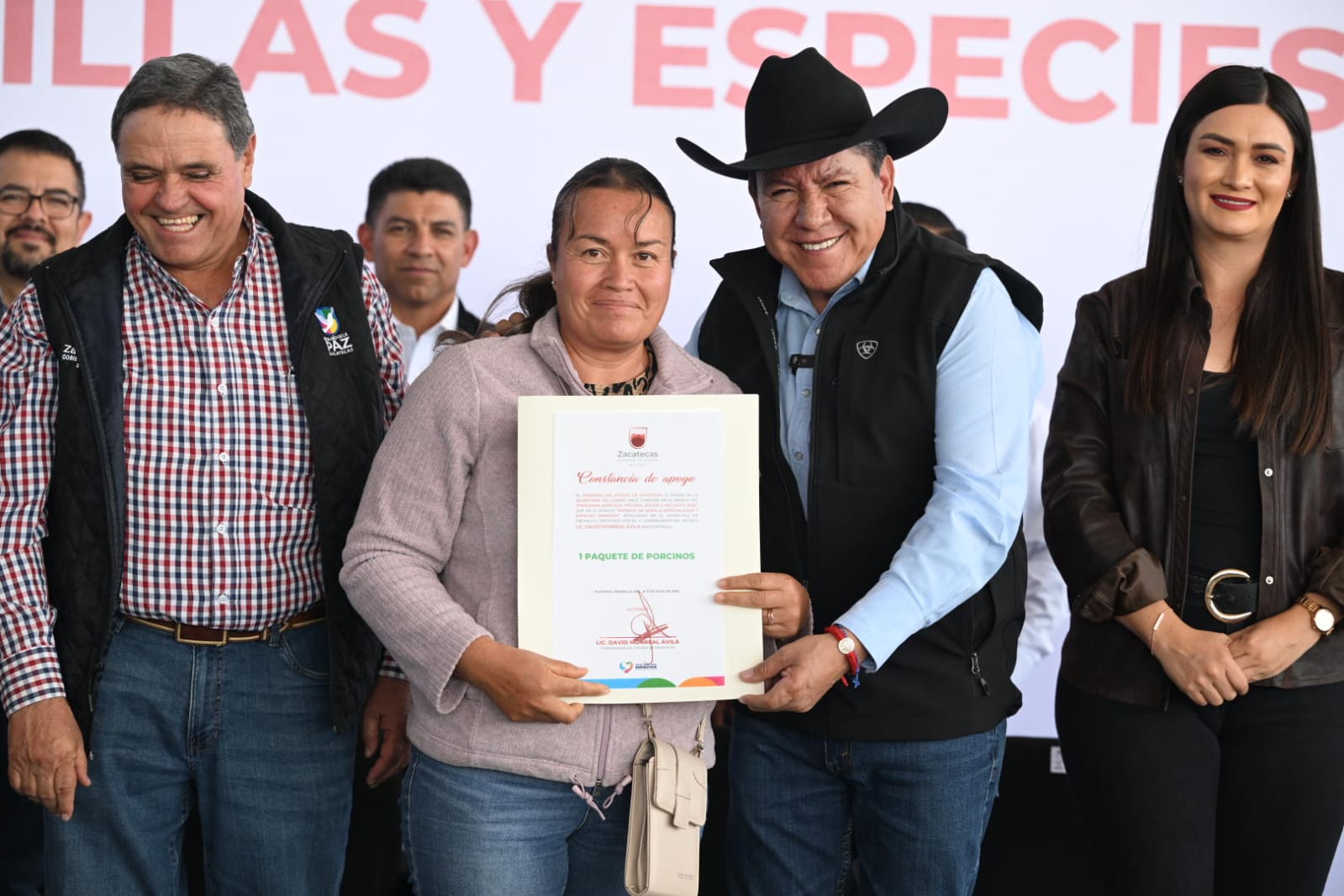 Hizo la entrega de paquetes de pie de cría de ovinos (hasta cuatro vientres y un semental) y porcinos (hasta tres vientres y un semental), así como apoyos en especie para la instalación de huertos hortofrutícolas y de nopal, dirigidos al autoconsumo y a la mejora en la calidad de vida de las familias rurales.