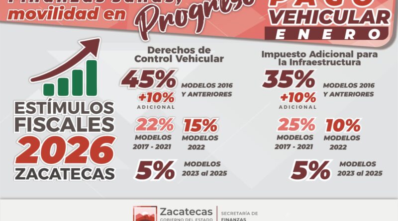 Zacatecas, Zac., 1 de enero de 2026.- El Gobierno encabezado por el mandatario David Monreal Ávila, a través de la Secretaría de Finanzas que encabeza Ruth Angélica Contreras Rodríguez, informa sobre los estímulos fiscales vigentes durante enero de 2026, orientados a facilitar el cumplimiento de las obligaciones vehiculares y apoyar la economía de las familias.