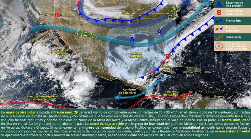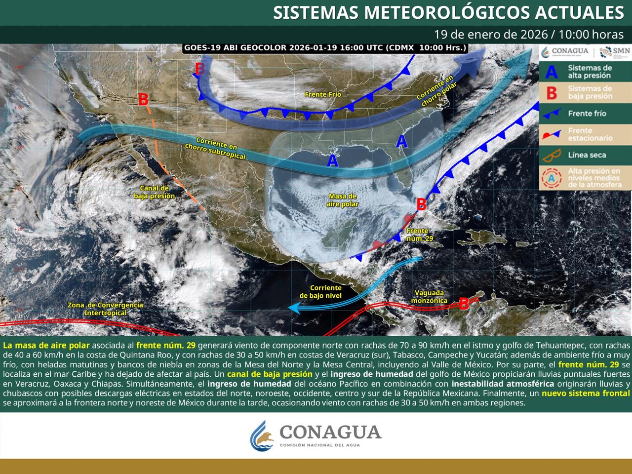 Reyes Mugüerza informó que, además de la presencia de lluvias, de acuerdo con los pronósticos del Servicio Meteorológico Nacional, se tienen previstas temperaturas de cero a menos cinco grados, sobre todo en las zonas serranas.