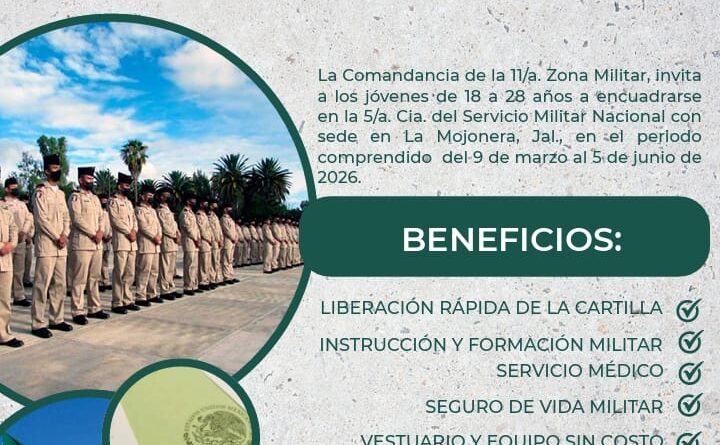 Guadalupe, Zac., 3 de febrero de 2026.- En colaboración con el Gobierno de Zacatecas, el Ejército Mexicano, a través de la Secretaría de la Defensa Nacional (Defensa) y la Comandancia de la Decimoprimera Zona Militar, invitó a jóvenes de entre 18 y 28 años de edad a encuadrarse en la Quinta Compañía del Servicio Militar Nacional, con el objetivo de liberar su cartilla en un periodo de tres meses.